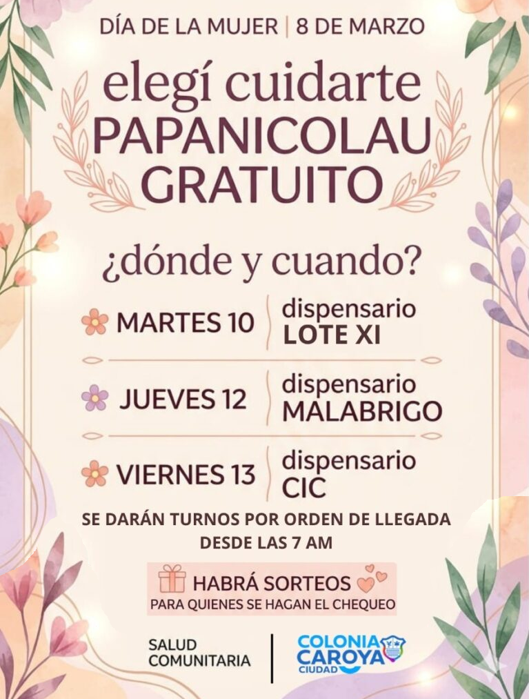 En el marco de las actividades por la Semana de la Mujer, la Municipalidad de Colonia Caroya puso en marcha una campaña de controles gratuitos de Papanicolaou (PAP) en diferentes dispensarios de la ciudad, destinada a mujeres con domicilio en la localidad.