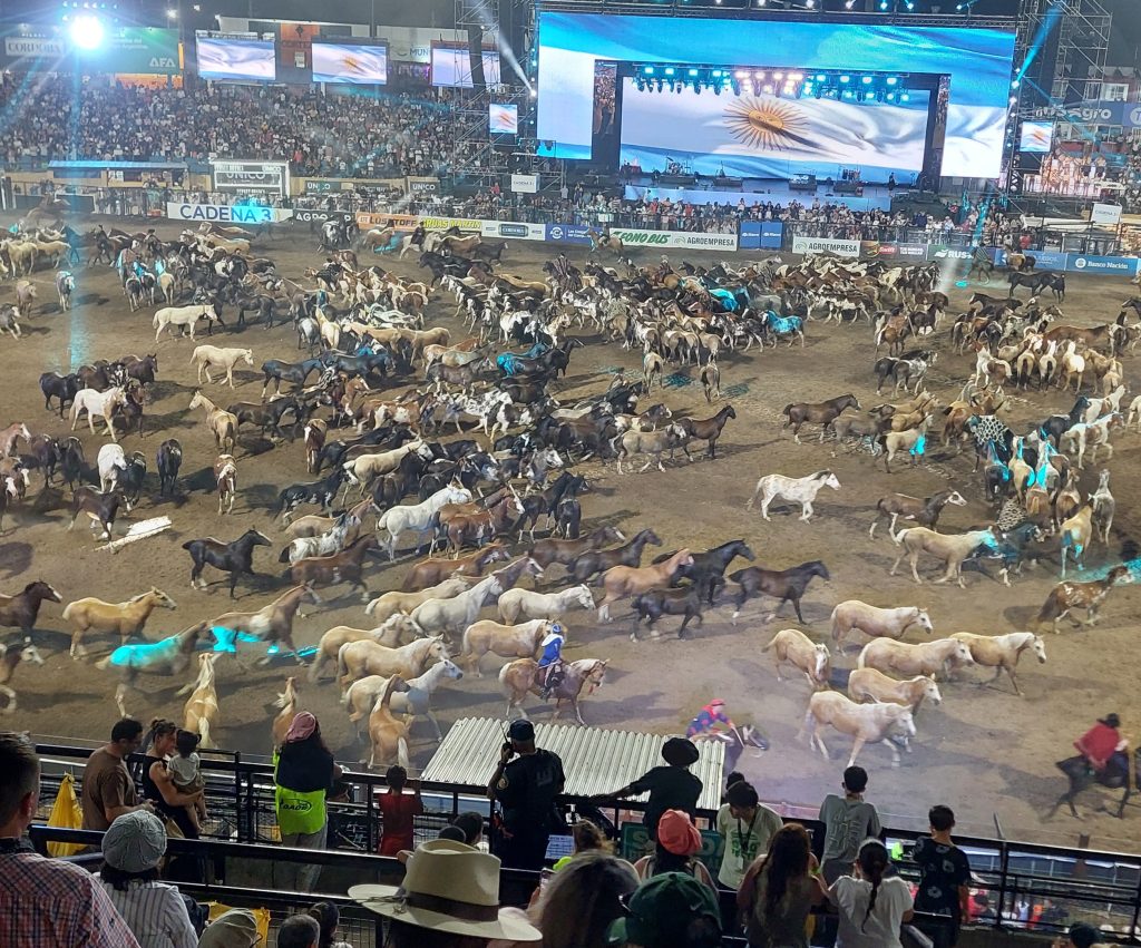 Uno de los momentos más destacados de la noche fue la última presentación de las Tropillas Entabladas: competencia y exhibición que cautivó al público cuando más de 40 tropillas cabalgaron en conjunto, regalando un espectáculo imponente.