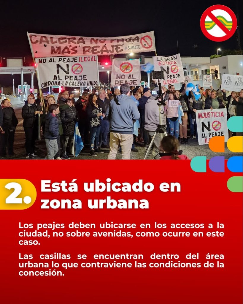 De acuerdo a los vecinos, la instalación contradice el acuerdo firmado con Caminos de las Sierras, que prohíbe peajes en áreas urbanas o suburbanas. “Está documentado. Es una avenida, no una ruta. Tiene semáforos, sendas peatonales, lomadas y velocidad máxima de 60 km/h”, detalló Moyano.