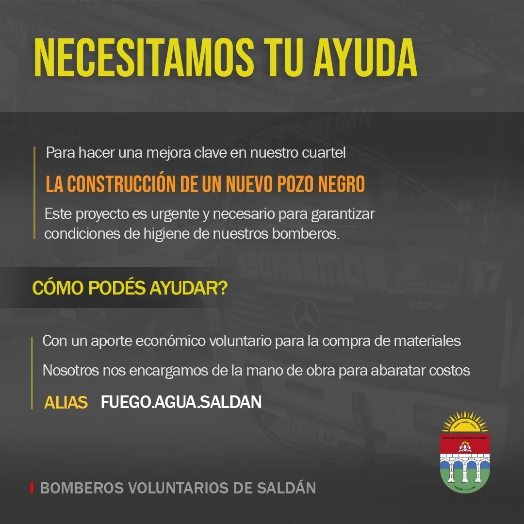 En ese marco, promueven una campaña para que la comunidad colabore con aportes económicos que están receptando en su cuenta. Las transferencias se pueden realizar al alias: FUEGO.AGUA.SALDAN