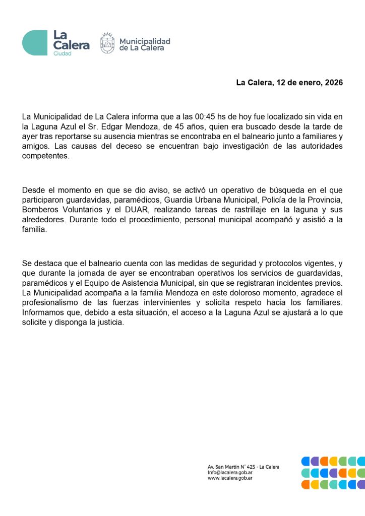 Desde la Municipalidad de La Calera, mediante un comunicado oficial, informaron que durante toda la jornada el balneario contaba con los servicios de seguridad y asistencia operativos, y que no se habían registrado incidentes previos. Asimismo, personal municipal acompañó y asistió a la familia durante el procedimiento.